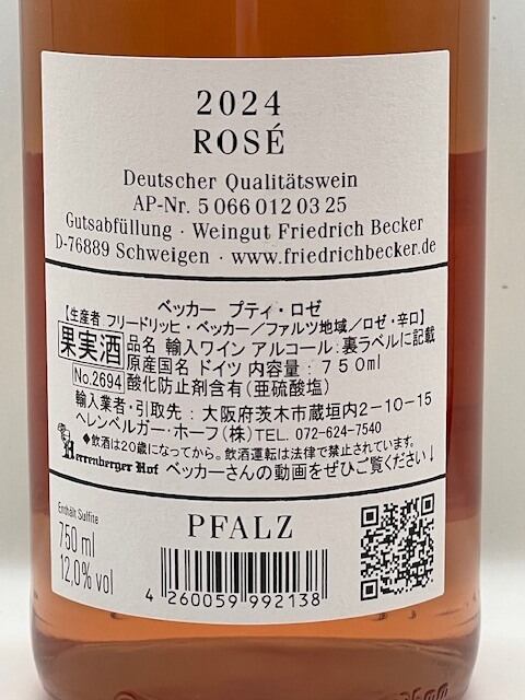 きつねのエチケットでおなじみのフリードリッヒ・ベッカーからロゼが到着!毎年楽しみにされている方も多いワインです。2024年ヴィンテージはシュペートブルグンダー(ピノ・ノワール)が60%、ポルトギーザーが40%というブレンド比率。フルーティーでチャーミングな味わいに仕上がっています。毎年少しずつ趣の違う味わいが魅力のプティ・ロゼ、ぜひお試しください!