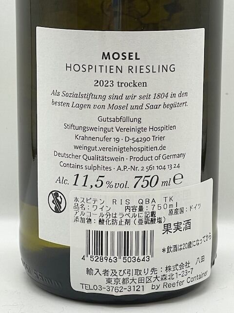 聖ヤコブ病院に端を発し、ドイツ最古の起源前330年から続くワインセラーを所有しています。現在でもワインの収益は、慈善事業の為に使われています。冷涼な産地の証であるキリっとした強めの酸と柑橘系果実のバランスがとてもエレガントで繊細なお食事のお伴に最適です。