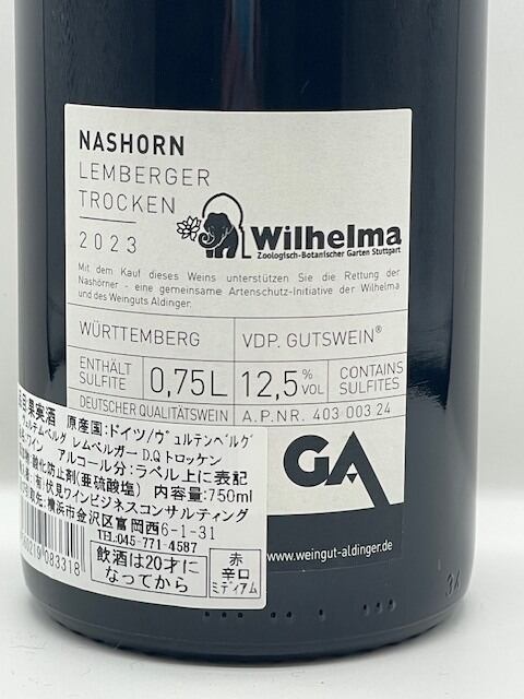 ヴュルテンベルクを代表する優良生産者。ナースホルンとはエチケットにも描かれたサイのこと。シュトゥットガルトのヴィルヘルマ動植物公園とこのワイナリーの共同企画で、ワインの購入代金がサイの救済に充てられているそうです。