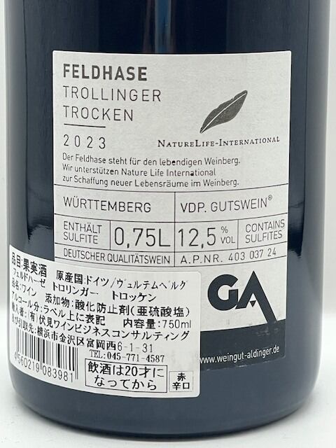 ヴュルテンベルクの優良生産者のトロリンガーが初登場。フェルトハーゼは野ウサギのことで、ヨーロッパでは繁栄の象徴とされています。ブドウ畑での生態系の保護のために活動するNatureLife-Internationalという団体を支援するために作られたワインだそうです。